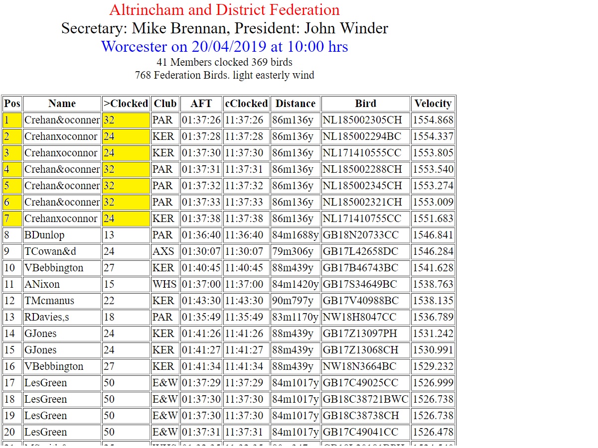 4月20日,伍斯特(Worcester),参赛鸽768羽:1-2-3-4-5-6-7位!